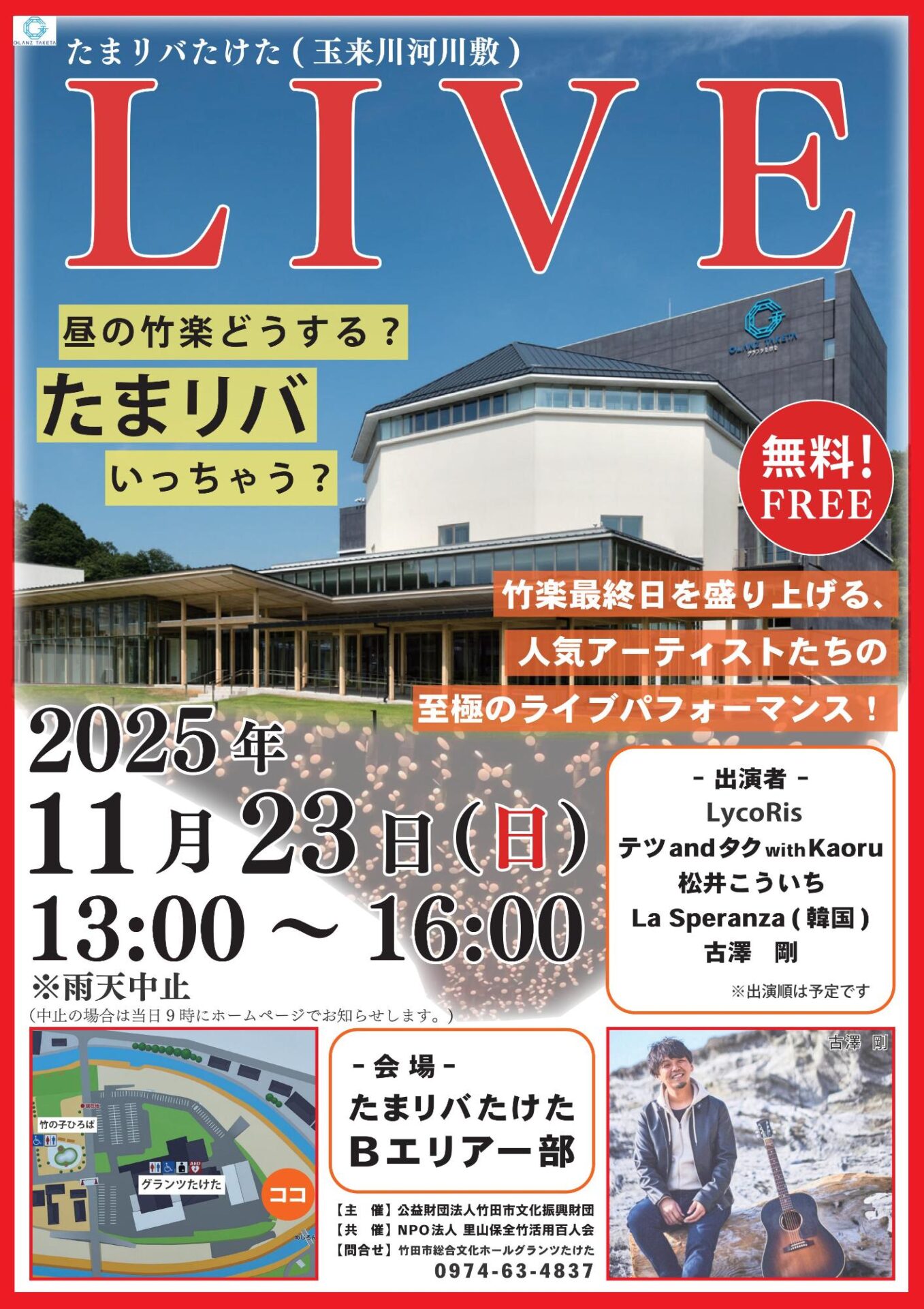 たまリバたけたでLIVEを開催します。「竹楽」の最終日を地元のアーティストが盛り上げます。イ…