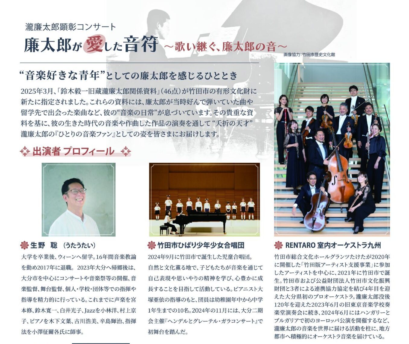 瀧廉太郎の遺したメロディや想いを、語り・弦楽演奏・合唱の多彩な表現で紡ぎながら、竹田ならではの あたたかいひととき をお届けします。