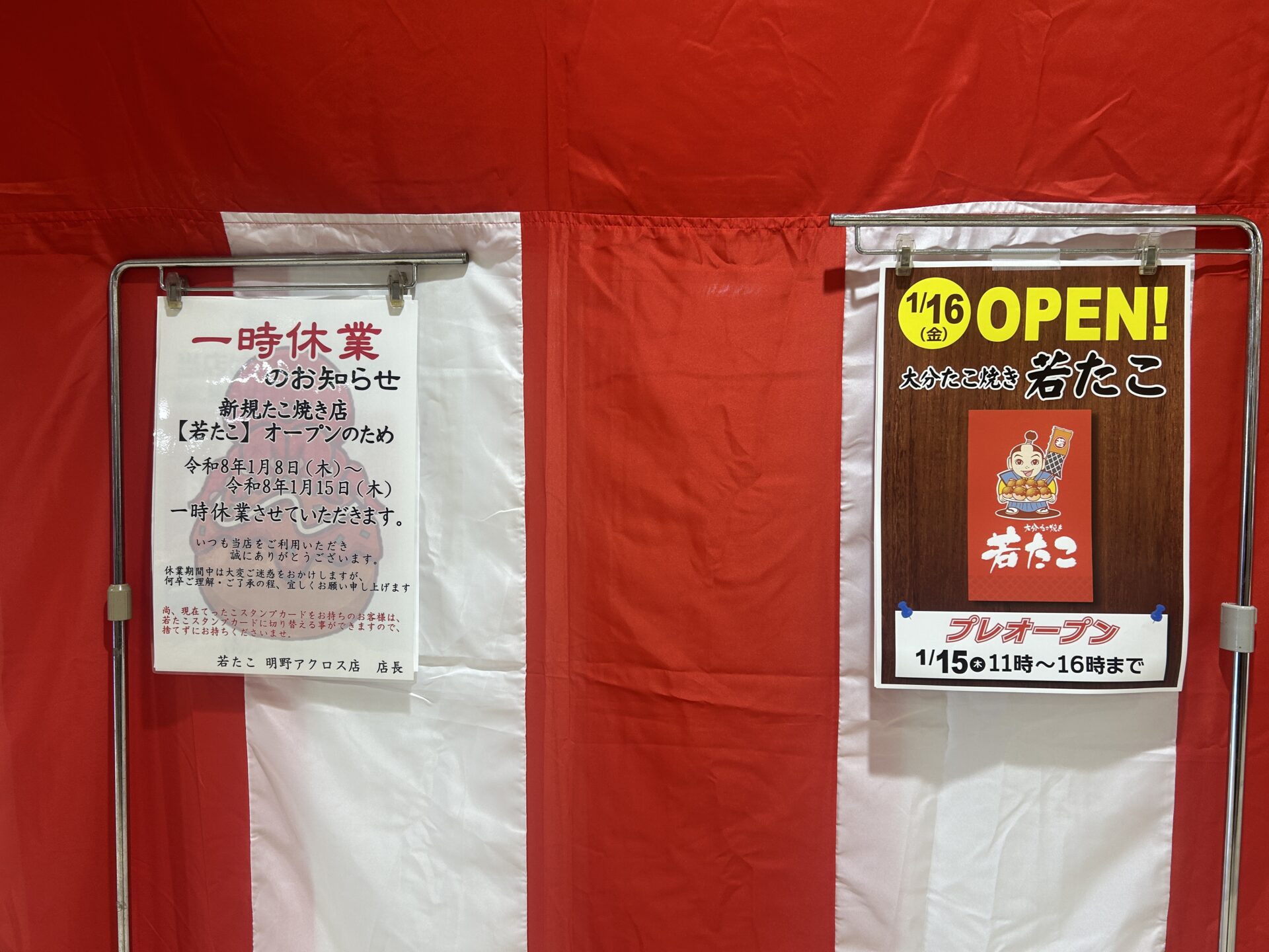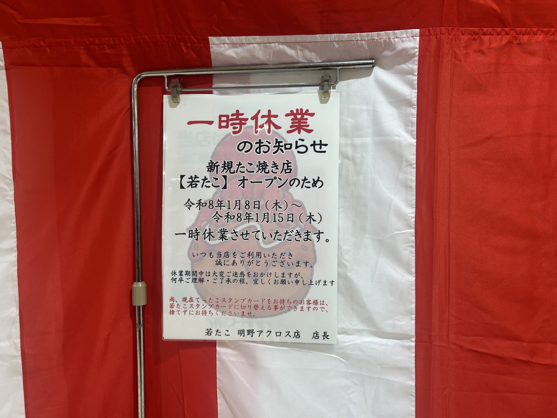 一時休業のお知らせによると、新規たこ焼き店【若たこ】を新たにオープンするとのこと。