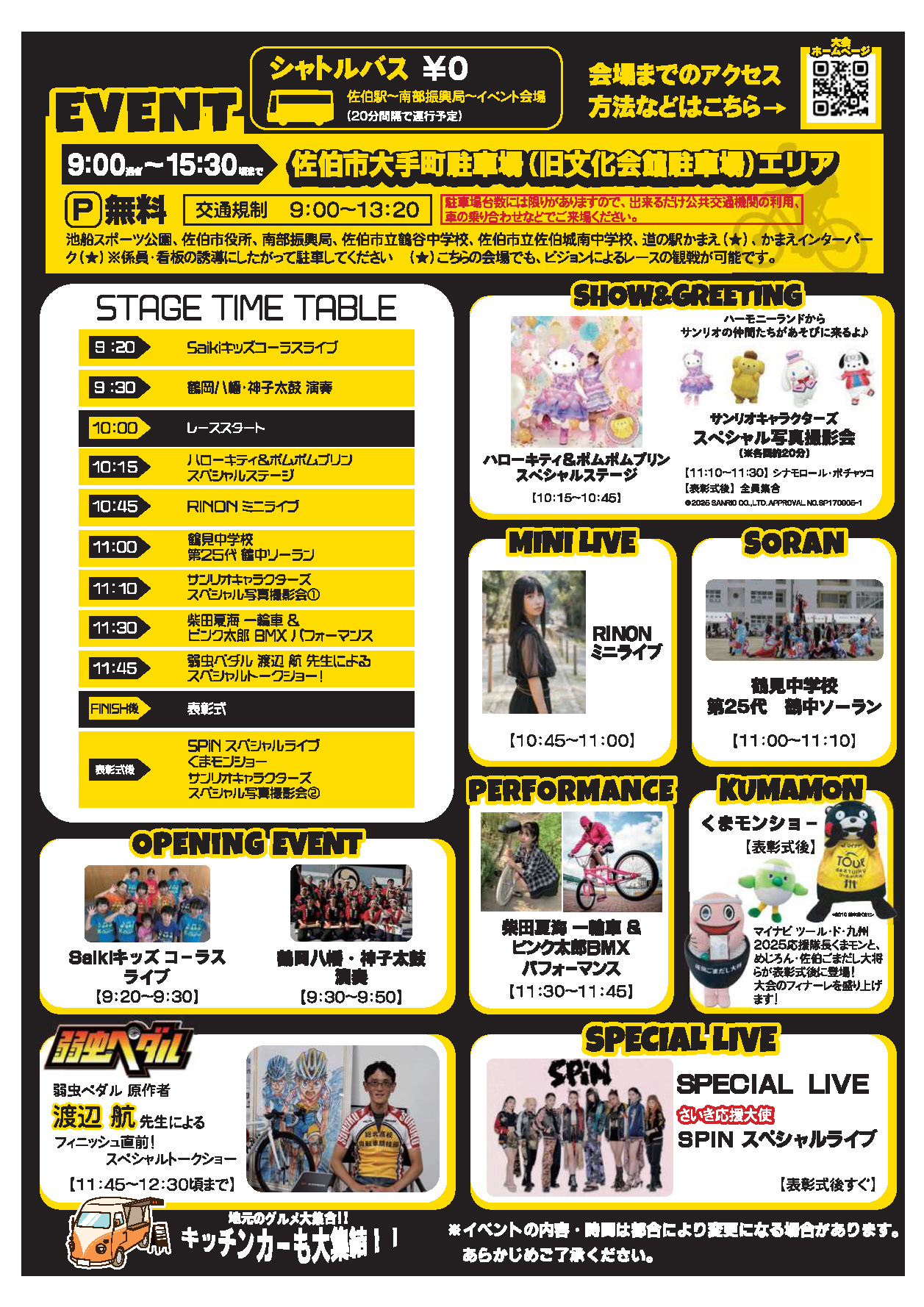 佐伯市大手町駐車場では、サンリオキャラクターズとのスペシャル写真撮影会やスペシャルステージの他、くまモンによるショーや『弱虫ペダル』の作者・渡辺航先生によるスペシャルトークショーなど、ロードレースがわからなくても楽しめるイベントが盛りだくさんです。