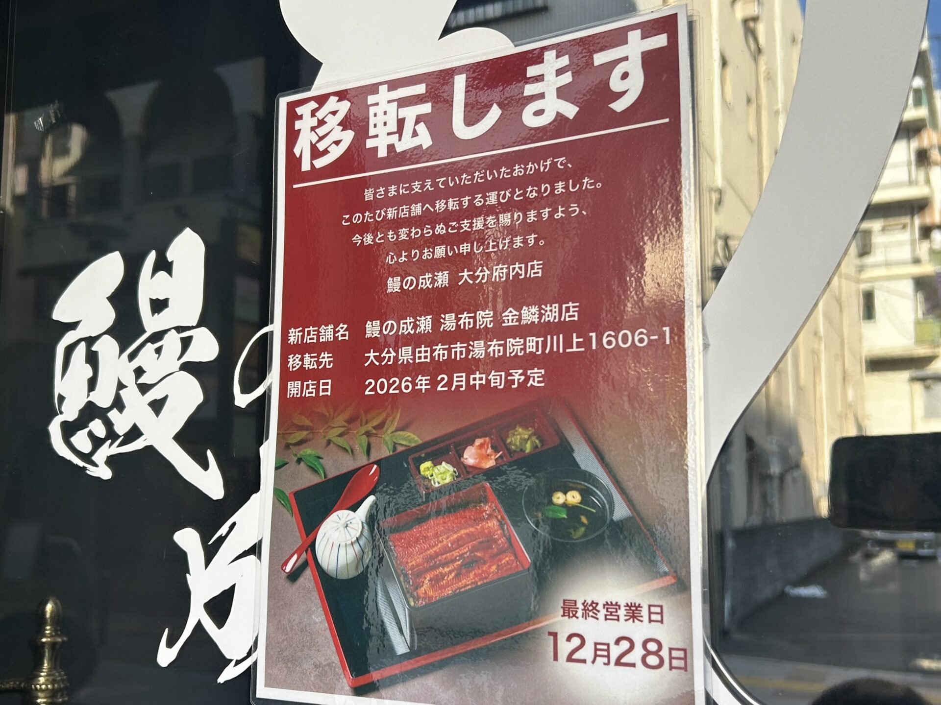 大分市府内町にある『鰻の成瀬 大分府内店』が、湯布院に移転するため閉店していました。