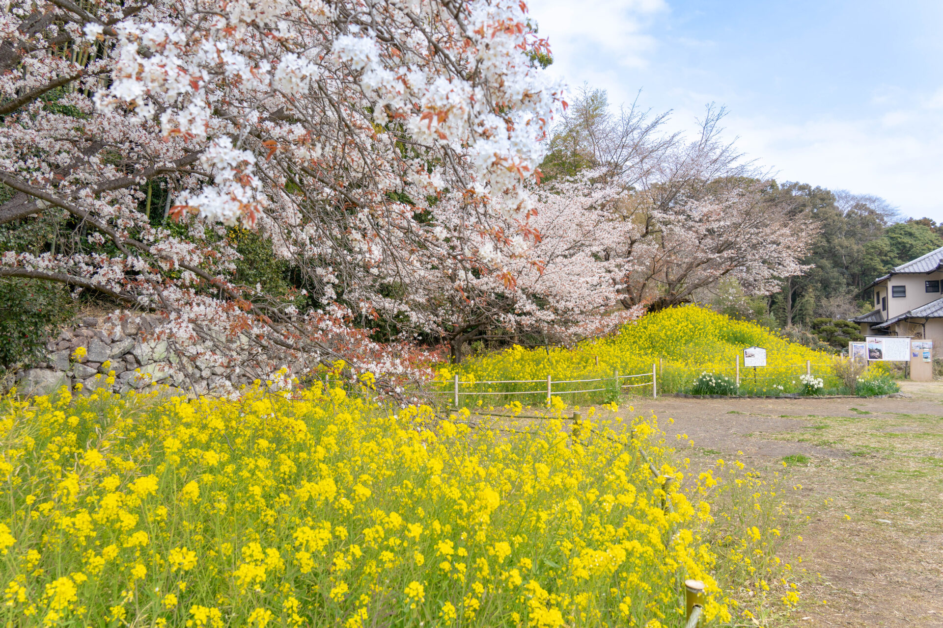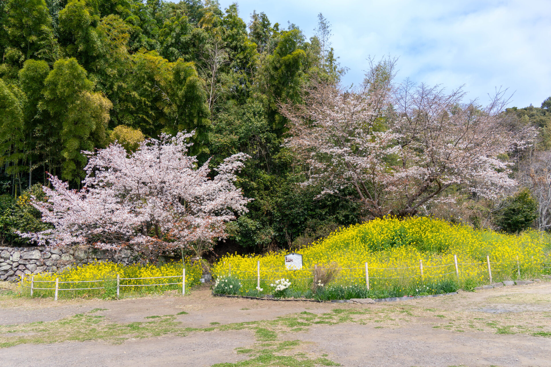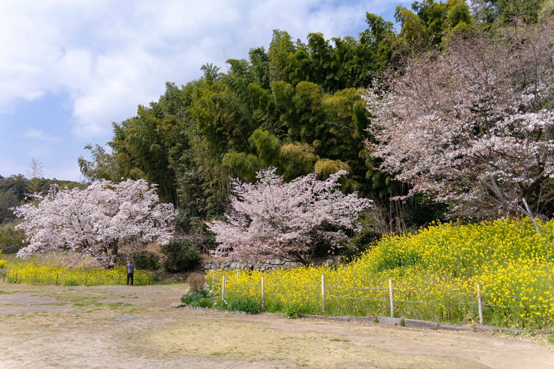 園内に入ると、黄色い菜の花とピンク色の魚見桜のコントラストがとても美しく、幻想的な雰囲気を感じました。