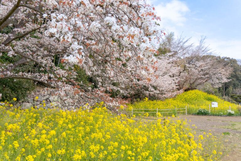 園内に入ると、黄色い菜の花とピンク色の魚見桜のコントラストがとても美しく、幻想的な雰囲気を感じました。