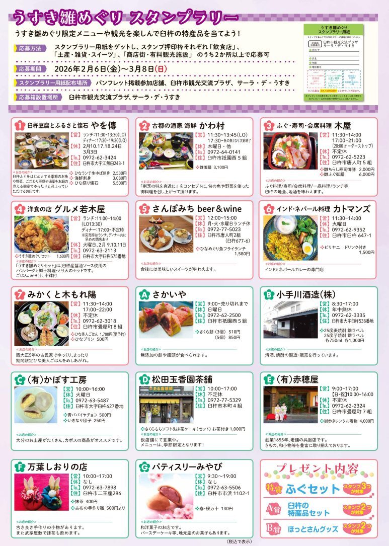スタンプ押印枠それぞれ「飲食店」「土産・雑貨・スイーツ」「商店街・有料観光施設」 のうち2か所以上で応募可。臼杵の特産品を当てよう!