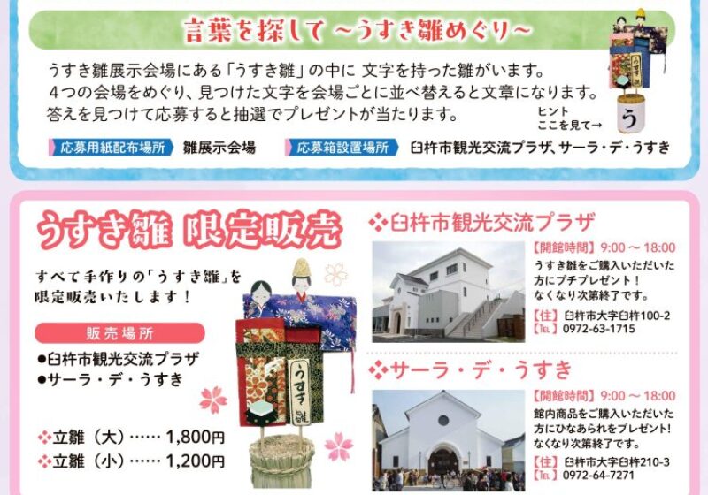 うすき雛展示会場にある「うすき雛」の中に文字を持った雛がいます。4つの会場をめぐり、見つけた文字を会場ごとに並べ替えると文章になります。答えを見つけて応募すると、抽選でプレゼントが当たります!