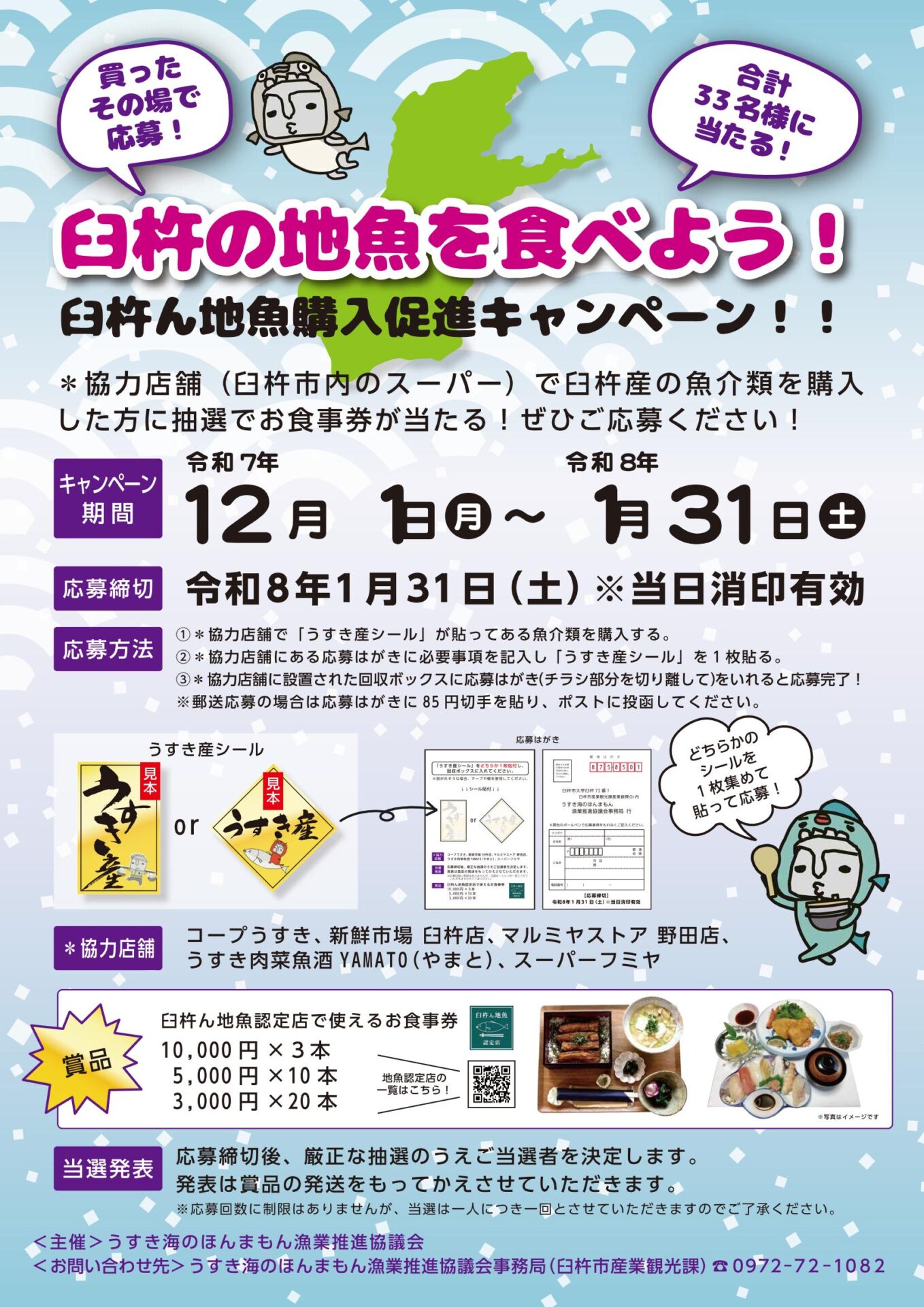 「うすき産シール」が貼り付けられた臼杵産魚介類を協力店舗で購入し、応募することで 臼杵ん地魚認定店で使える “お食事券”が当たるキャンペーンを実施中!