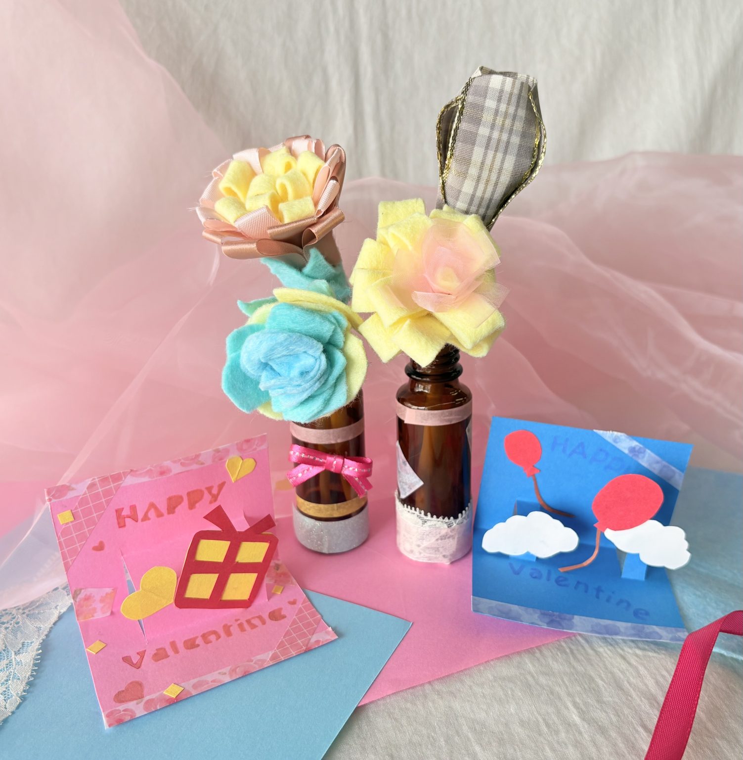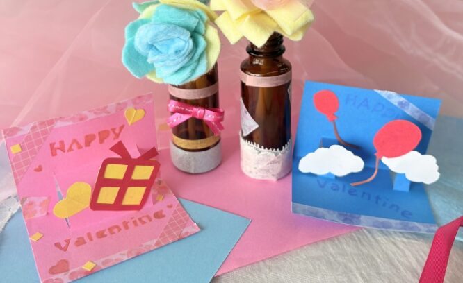 フェルトやリボン、布の切れ端でフラワーを作ります!また 色画用紙に切れ込みを入れ、飛び出すメッセージカードを制作します♡