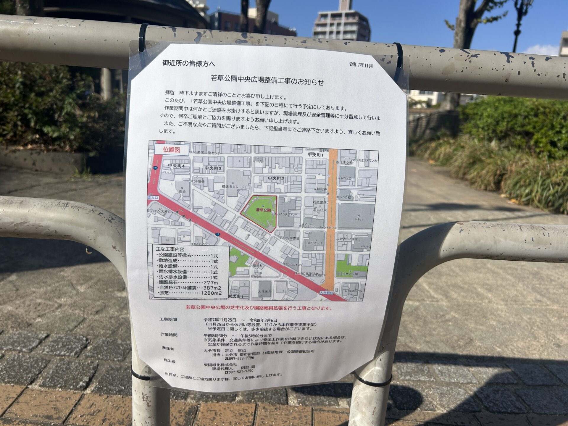 公園の入口には、「若草公園中央広場整備工事工事のお知らせ」が掲示されており、その中に【若草公園中央広場の芝生化及び園路幅員拡張を行う工事となります】と赤字で記載がありました。