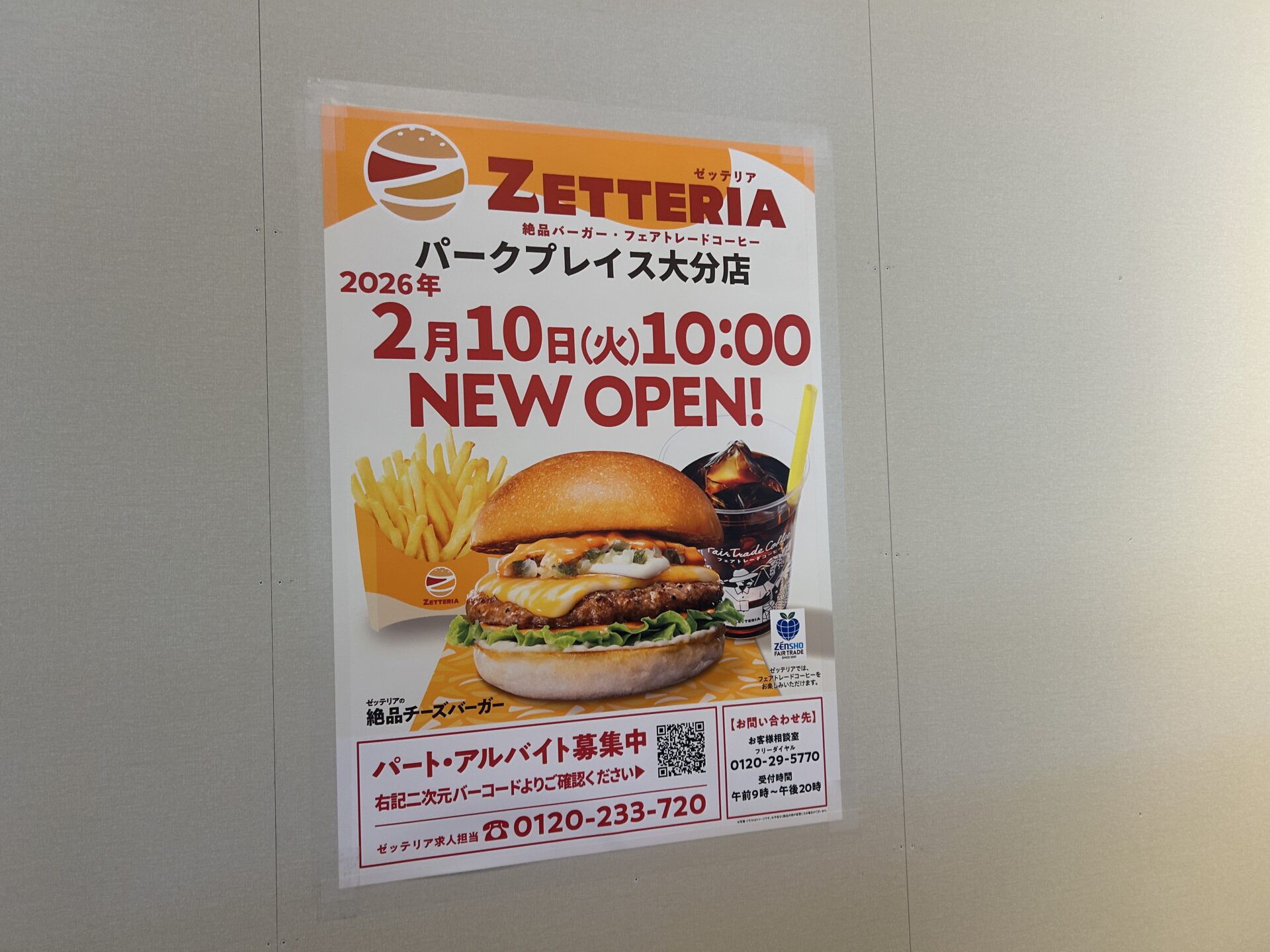 お知らせによると、『ゼッテリア パークプレイス大分店』は2026年2月10日(火)10:00にオープンするそうです。